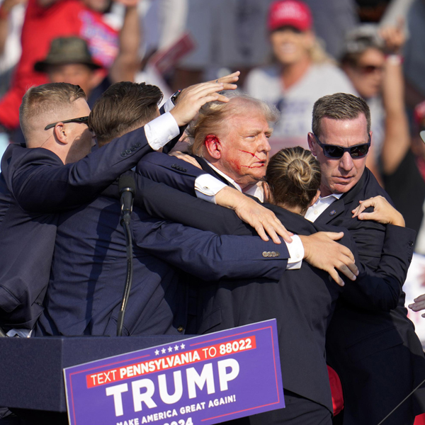 米東部ペンシルベニア州での集会で演説中に発砲されたトランプ前大統領(中央)/(C)AP=共同