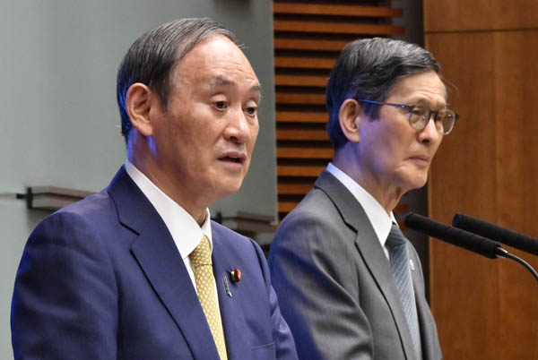 官邸で会見をする菅義偉首相と、政府コロナ分科会の尾身茂会長(C)JMPA