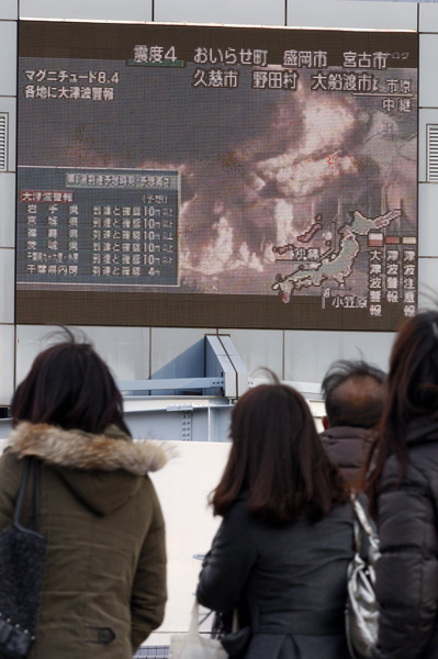 3・11のとき、多くの人が地震速報の街頭モニターを見つめた/(C)日刊ゲンダイ