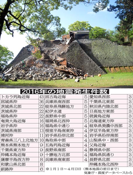 甚大な被害を受けた熊本城と「16年の地震発生件数」表(C)日刊ゲンダイ