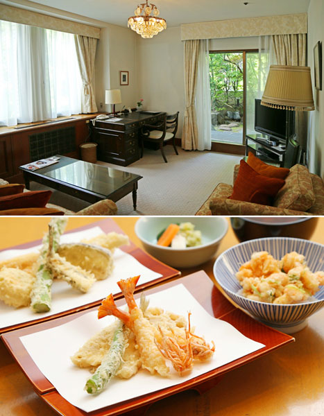 403号室の庭付きスイートルーム。デスクの正面に山口瞳の絵が(下はランチのてんぷら)/(C)日刊ゲンダイ