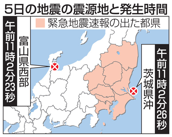 5日の地震の震源地と発生時間(C)共同通信社