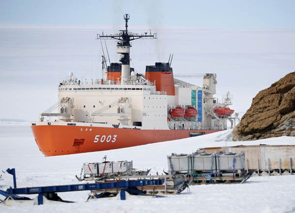 南極・昭和基地沖に接岸した観測船「しらせ」/(南極観測隊同行記者撮影)