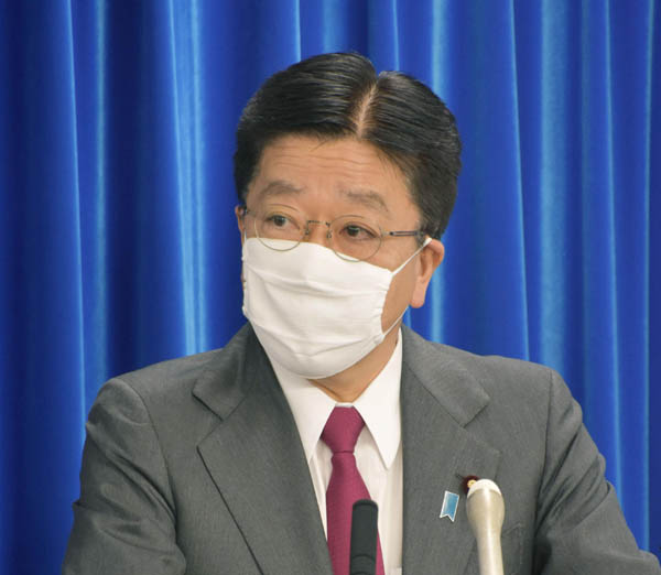 布マスクに汚れがあった問題について話す加藤厚労相(C)共同通信社