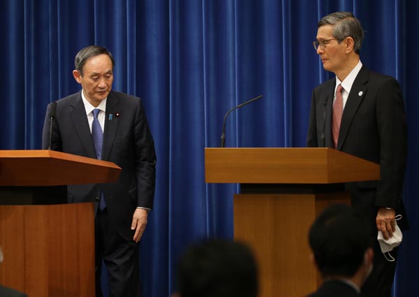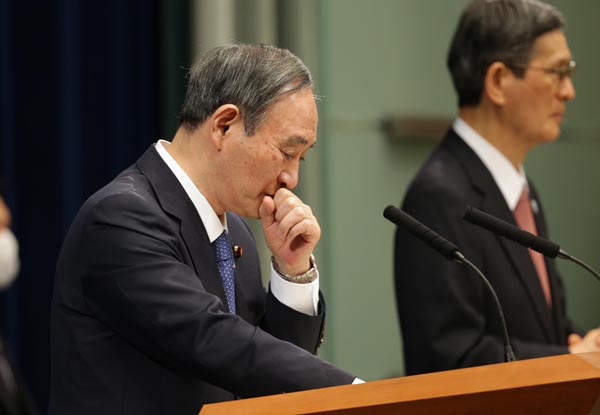 相変わらずの棒読みスカスカ会見(1都3県に「緊急事態宣言」、会見する菅義偉首相、右は尾身会長)/(C)JMPA