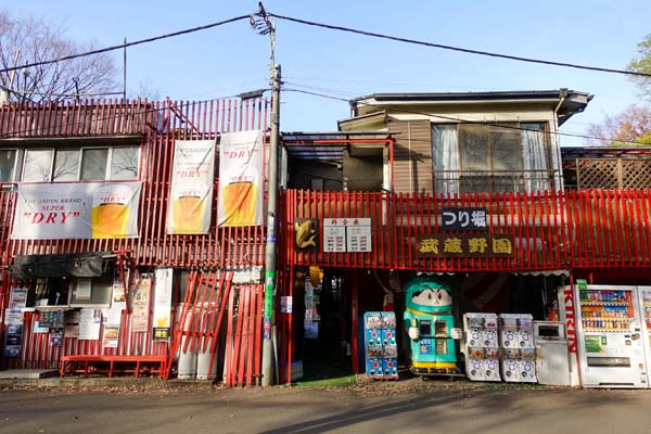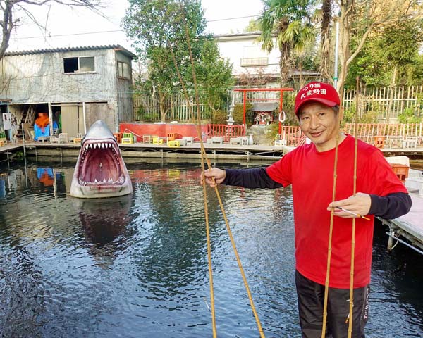 和田堀公園の釣り堀は創業70年 「ジョーズ」のハリボテが