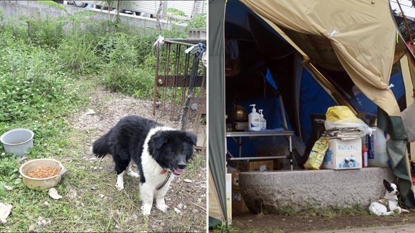 2016年熊本地震時の避難状況1(在宅避難。倒壊危険のある自宅にペットを残し、飼い主は避難所から世話に通うことに=左。テント泊。ペットと一緒に生活できるが支援は届きにくく健康上の問題も生じやすい=右)/(提供写真)