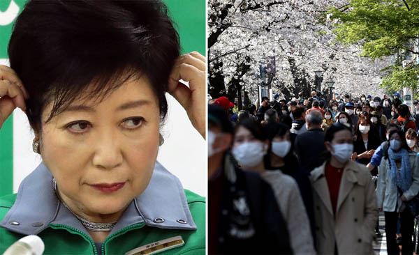 都は「市中感染は確認されていない」の一点張り(23日、東京・中目黒の桜を見に繰り出した人々。小池百合子都知事=左)/(C)日刊ゲンダイ