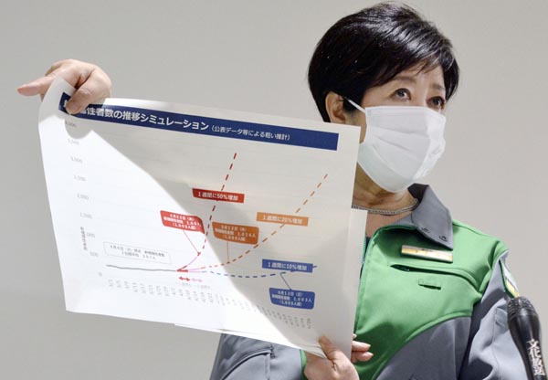 試算データを示す小池百合子都知事。5月中旬には1日4000人!(C)共同通信社