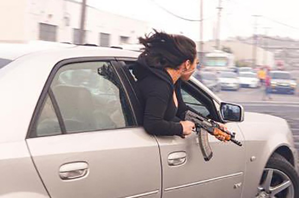 助手席から身を乗り出した女性が構える軍用銃はホンモノ! これぞアメリカ