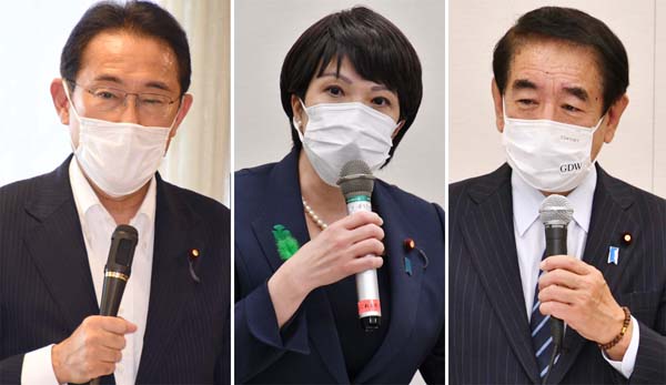 フルスペックの総裁選!?(左から岸田前政調会長、高市前総務相、下村政調会長)/(C)日刊ゲンダイ