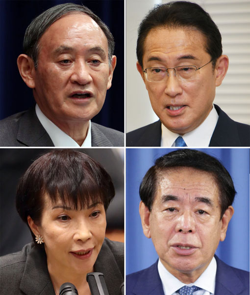 「菅vs岸田」の一騎打ちにはしたくない(左上から時計回りに、菅首相、岸田元外相、下村政調会長、高市元総務相)/(C)日刊ゲンダイ