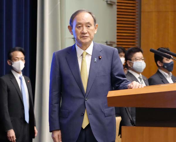 緊急事態宣言などの解除を決定し、記者会見に臨む菅首相(C)共同通信社
