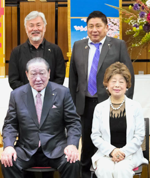 井ノ口忠男容疑者(後列右)と藪本雅巳容疑者(同左)、手前は田中英寿理事長夫妻(=日大のHPから、トリミングしています)