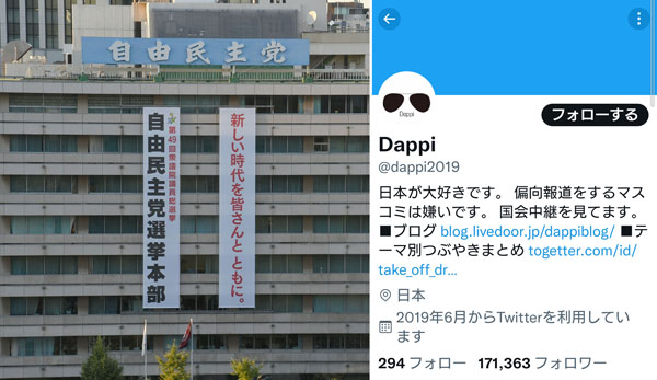 自民党本部(左)と「Dappi」のツイッターアカウント(C)日刊ゲンダイ