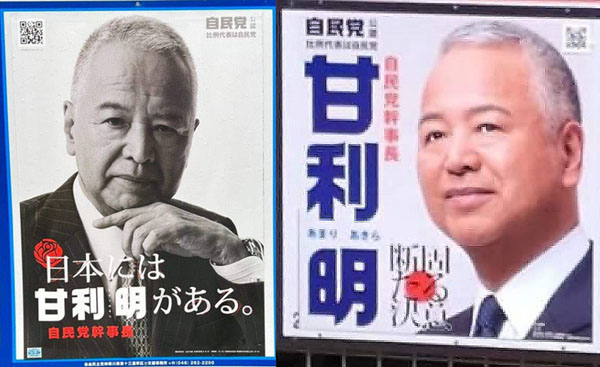 焦る甘利幹事長“ナルシスト選挙ポスター”全面張り替え 応援そっちのけで異例の地元ベタ張り