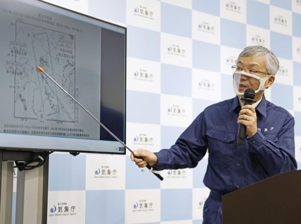 山梨県で震度5弱を観測した地震について記者会見する気象庁の担当者=3日午前、気象庁(C)共同通信社