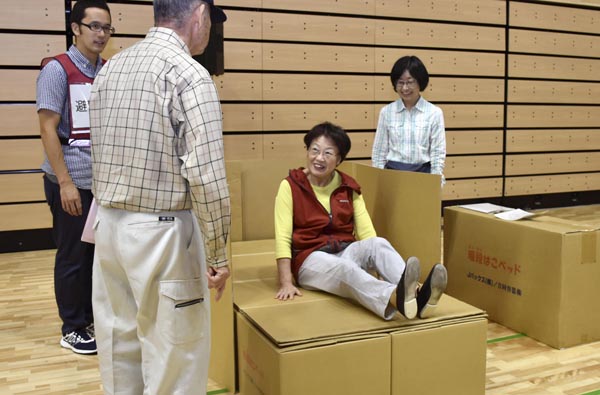 段ボールベッドは底冷えを防ぐ(札幌市が実施した防災訓練で、段ボールベッドを組み立てる市民ら)/(C)共同通信社