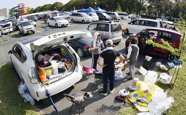 熊本地震では車中泊のクルマで駐車場が満車に(C)共同通信社