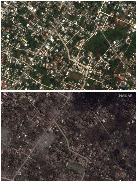 トンガ沖海底火山の噴火前(上)と後の衛星画像(C)2022MaxarTechnologies /ロイター