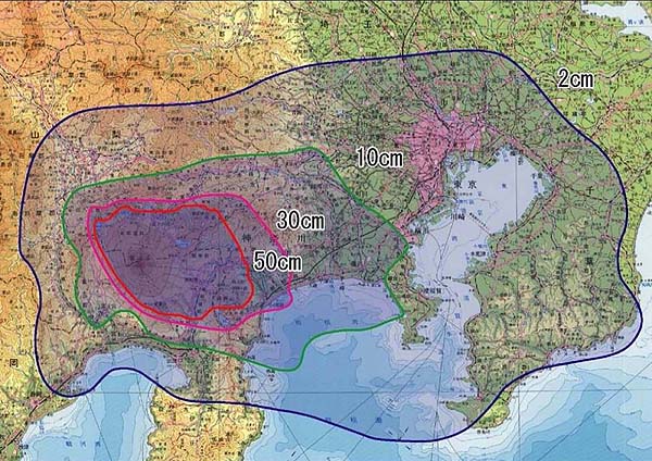 富士山噴火による降灰量(「富士山ハザードマップ」から)