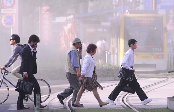 桜島噴火のの降灰でかすむ鹿児島市街(2012年)/(C)共同通信社