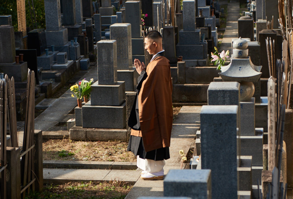 墓地で祈りをささげる西村宏堂さん(撮影)佐藤将希