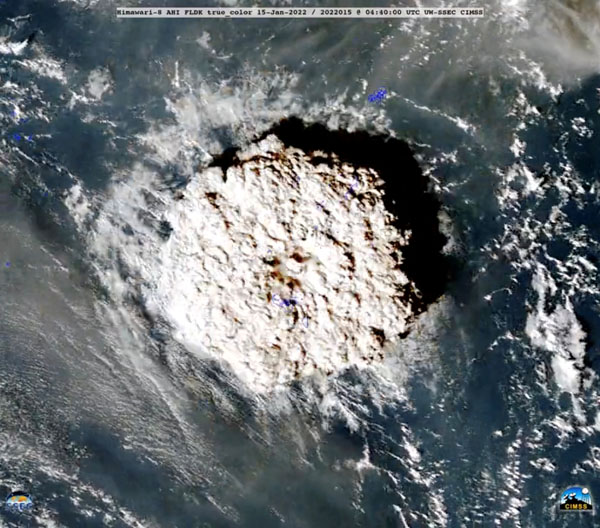 ハンガ・トンガ・ハンガ・ハアパイが噴火した後、火山灰がトンガ上空に上昇した(C)ロイター/NOAA/SSEC/CIMSS