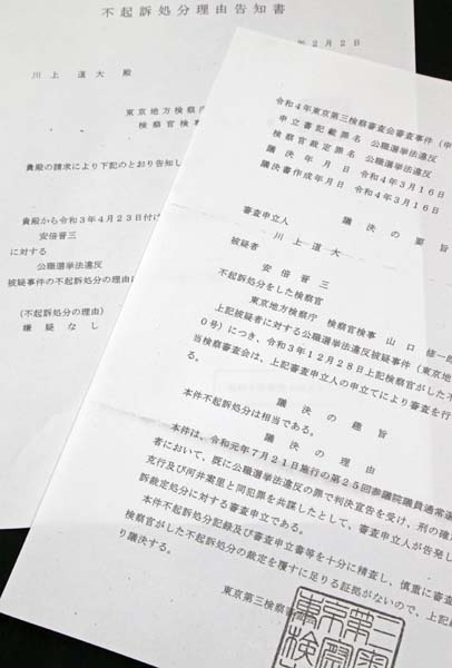 参院広島買収事件 検察審査会は安倍晋三元首相を「不起訴」にしていた
