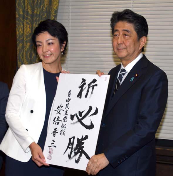 自民党参院選比例公認証書授与式での安倍首相と河井案里(2016年当時)/(C)日刊ゲンダイ