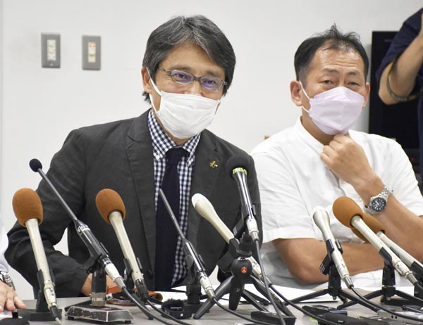 京都新聞HDの元相談役らの告発状を京都地検に提出し、記者会見した同紙社員の日比野敏陽さん(左)ら(6月29日、京都市)/(C)共同通信社
