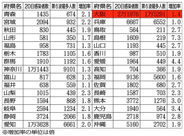30府県の「20日までの感染者数」と「第6波までの最多」と比較、大阪の2万1976人は東京の過去最多より多かった(C)日刊ゲンダイ