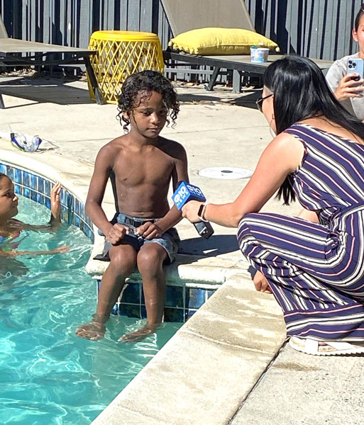 事故現場のプールサイドでABCの取材を受けてるマシア君(ティアラさんのフェイスブックから)