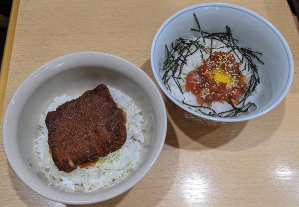 まぐろピリ辛ユッケ丼(右)とまぐろカツ丼(C)日刊ゲンダイ