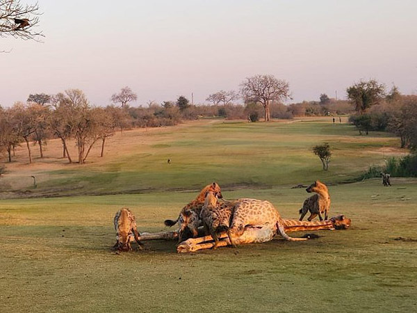 南ア「世界一危険なゴルフコース」の日常 ライオンに襲われたキリンに群がる20頭のハイエナ