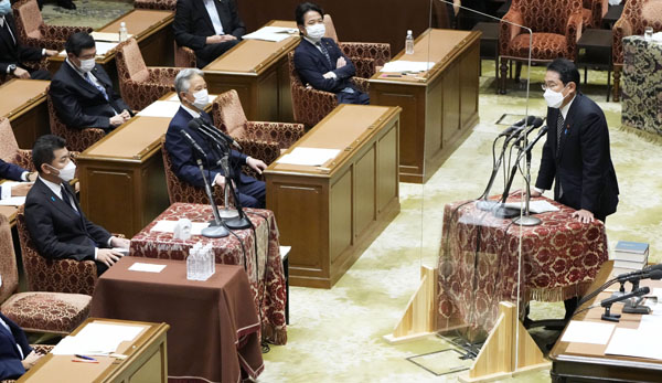 衆院議運委で立憲民主党の泉代表(左端)の質問に答弁する岸田首相(C)共同通信社