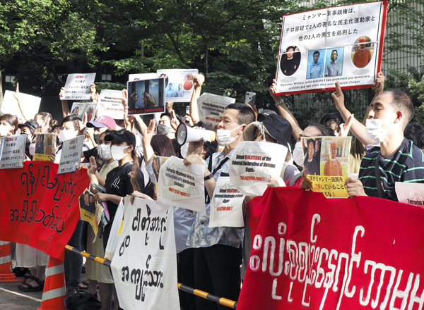 岸田首相の国葬根拠は「民主主義を守り抜く決意を示す」ではなかったか(国軍への抗議集会で声を上げる在日ミャンマー人ら)/(C)共同通信社