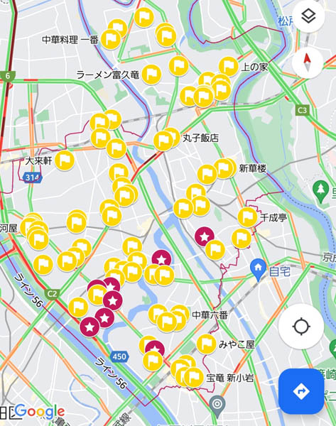 2019年2月以降、筆者が訪れた葛飾区の日本式昭和スタイルの町中華、全79軒。このうち、赤色の星印8軒は訪問後に廃業(C)日刊ゲンダイ