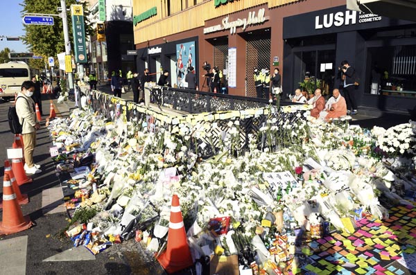 たくさんの花が手向けられる梨泰院の事故現場(C)共同通信社