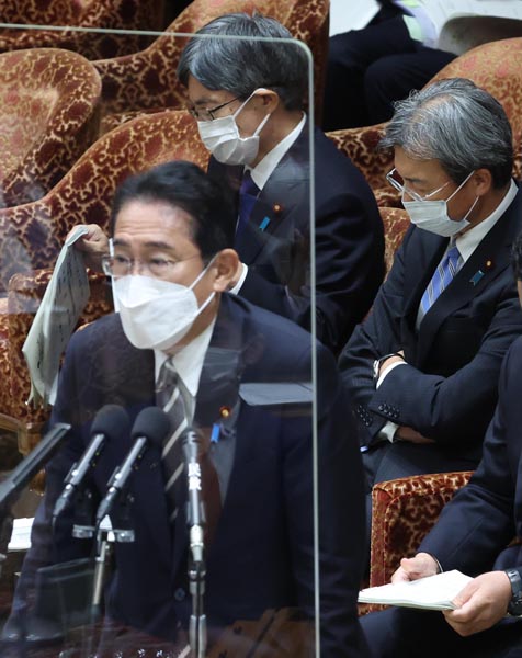 いずれ国民の関心も薄れ“逃げ切れる”と踏んでいる(寺田、秋葉両大臣を後ろ手に、答弁する岸田首相)/(C)日刊ゲンダイ