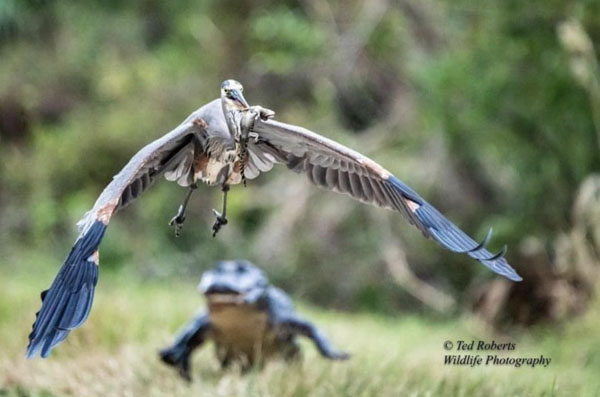 オオアオサギがくわえているのはアリゲーターの赤ちゃん(オーランド・ウェットランズ・パークのフェイスブックから)