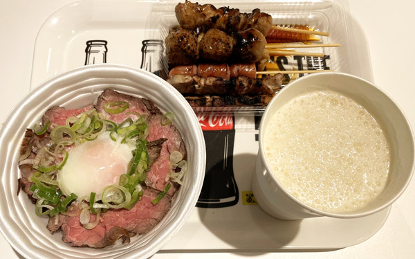 ローストビーフ丼と焼き鳥、ビール(C)日刊ゲンダイ