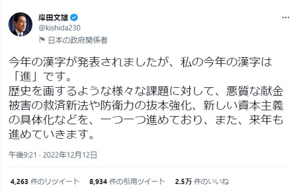 岸田首相「私の今年の漢字は『進』」KY投稿に国民怒り!《増税が進むから?》とツッコミの嵐