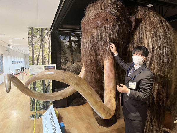 マンモスと学芸員の畠誠さん(C)日刊ゲンダイ