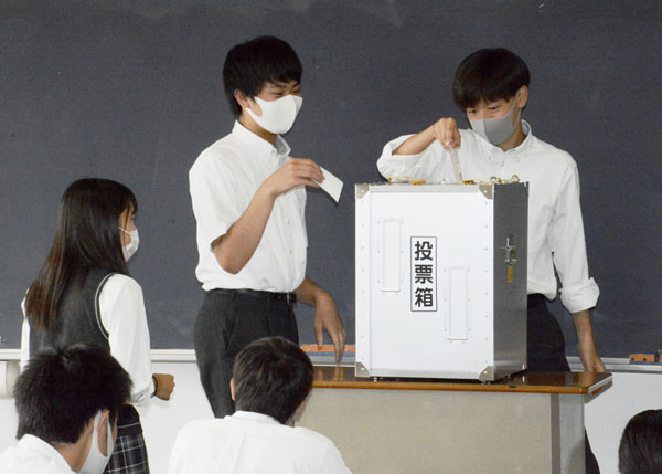 投票できる年齢が18歳に引き下げられて7年。片や被選挙権年齢は今なお見直し無し(模擬投票の授業で1票を投じる高校3年生)/(C)共同通信社