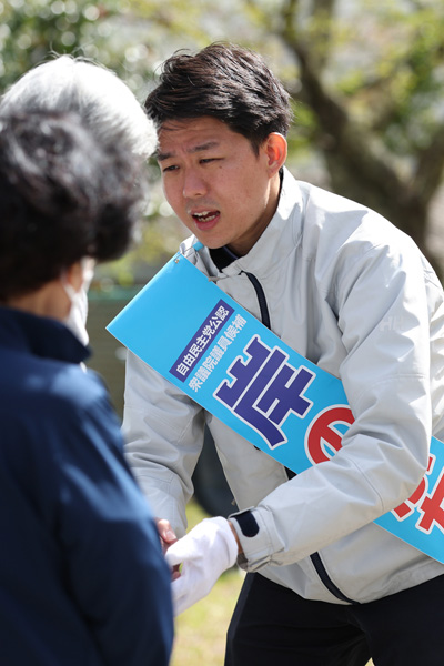 選挙の争点は「世襲」と「教団(旧統一教会)」だけに…(地元周りをする岸信千世氏)/(C)日刊ゲンダイ