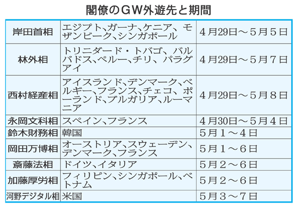 閣僚のGW外遊先と期間(C)日刊ゲンダイ