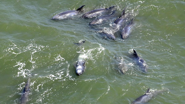 千葉県いすみ市と一宮町の境界付近を泳ぐイルカ=4月3日(C)共同通信社