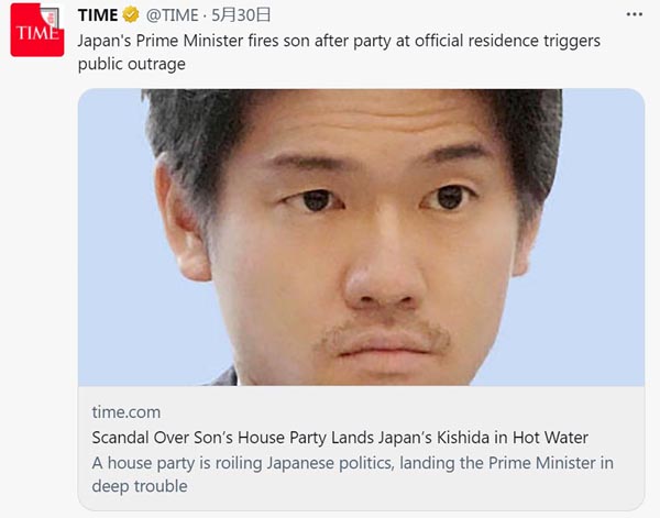 岸田首相の長男、翔太郎首相秘書官はすっかり有名人に(米タイム誌ツイッターから)