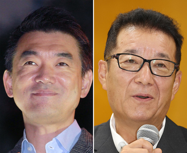何をするつもりなのか?(元大阪府知事、元大阪市長の橋下徹氏と松井一郎氏=右)/(C)日刊ゲンダイ